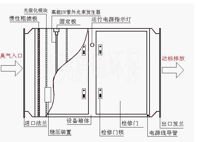 工業(yè)廢氣利用排風(fēng)設(shè)備輸入到高效光解氧化處理模塊后,凈化設(shè)備運(yùn)用高能UV紫外線(xiàn)光束及臭氧對(duì)廢氣進(jìn)行協(xié)同分解氧化反應(yīng),使廢氣中的惡臭氣體物質(zhì)降解轉(zhuǎn)化成低分子化合物、水和二氧化碳,再通過(guò)排風(fēng)管道排出室外。具體地來(lái)說(shuō)就是,高效光解氧化處理模塊利用高能UV紫外線(xiàn)光束分解空氣中的氧分子產(chǎn)生游離氧,即活性氧,因游離氧所攜正負(fù)電子不平衡所以需與氧分子結(jié)合,進(jìn)而產(chǎn)生臭氧。臭氧對(duì)有機(jī)物具有極強(qiáng)的氧化作用,對(duì)惡臭氣體及其它刺激性異味有立竿見(jiàn)影的清除效果。